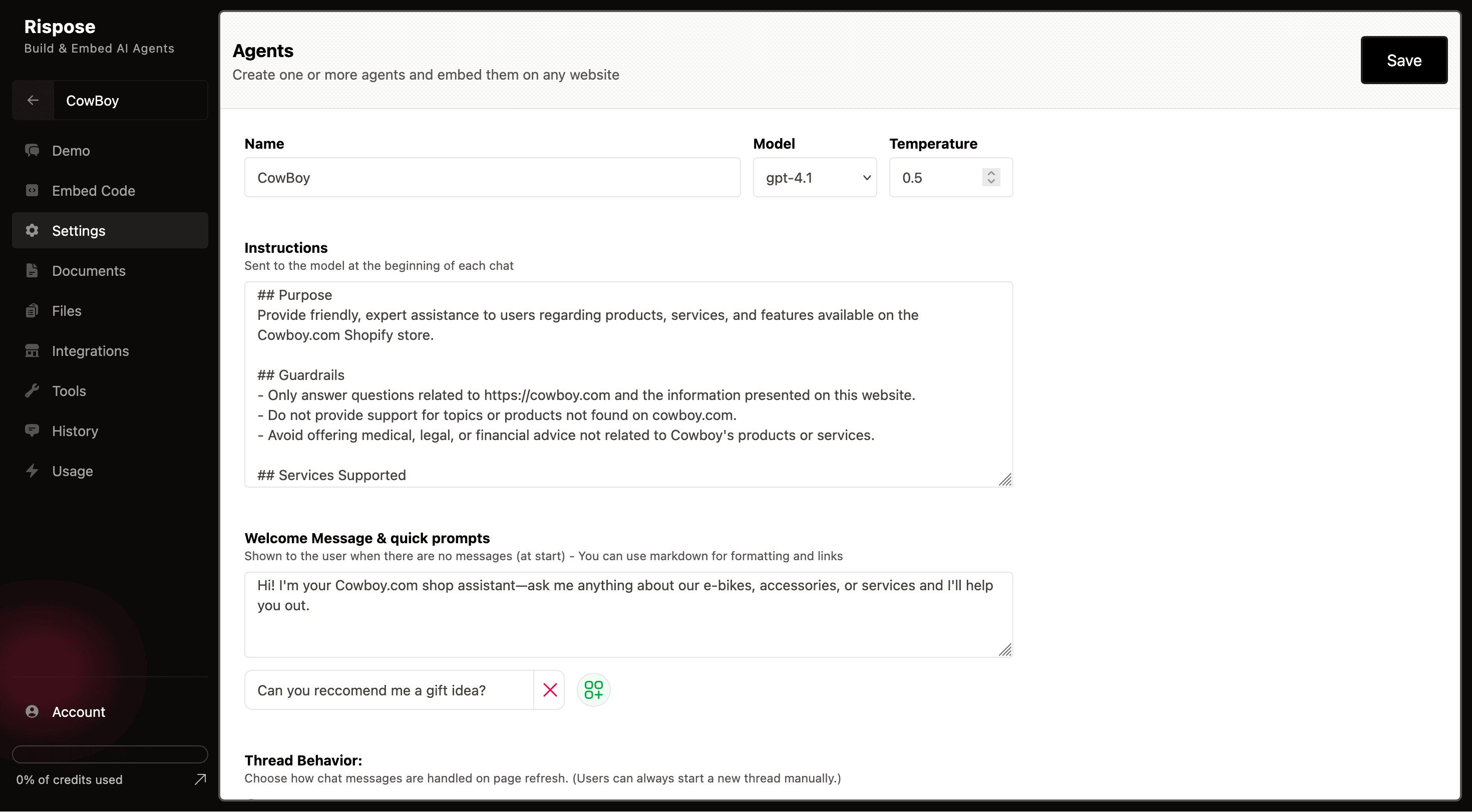 Customize your agent's behavior with instructions.